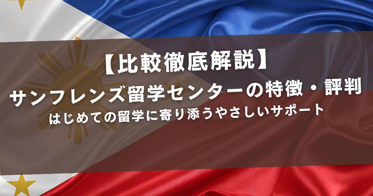 本記事では、サンフレンズ留学センターの特徴・評判・注意点に加え、スマ留・タビケン留学・CEBU21・ミライズ留学・QQEnglish・KRM留学・CEBRIDGE・スクールウィズ・ネイティブキャンプ留学・フィリピン留学センター(DEOW)との比較まで詳しくまとめます。